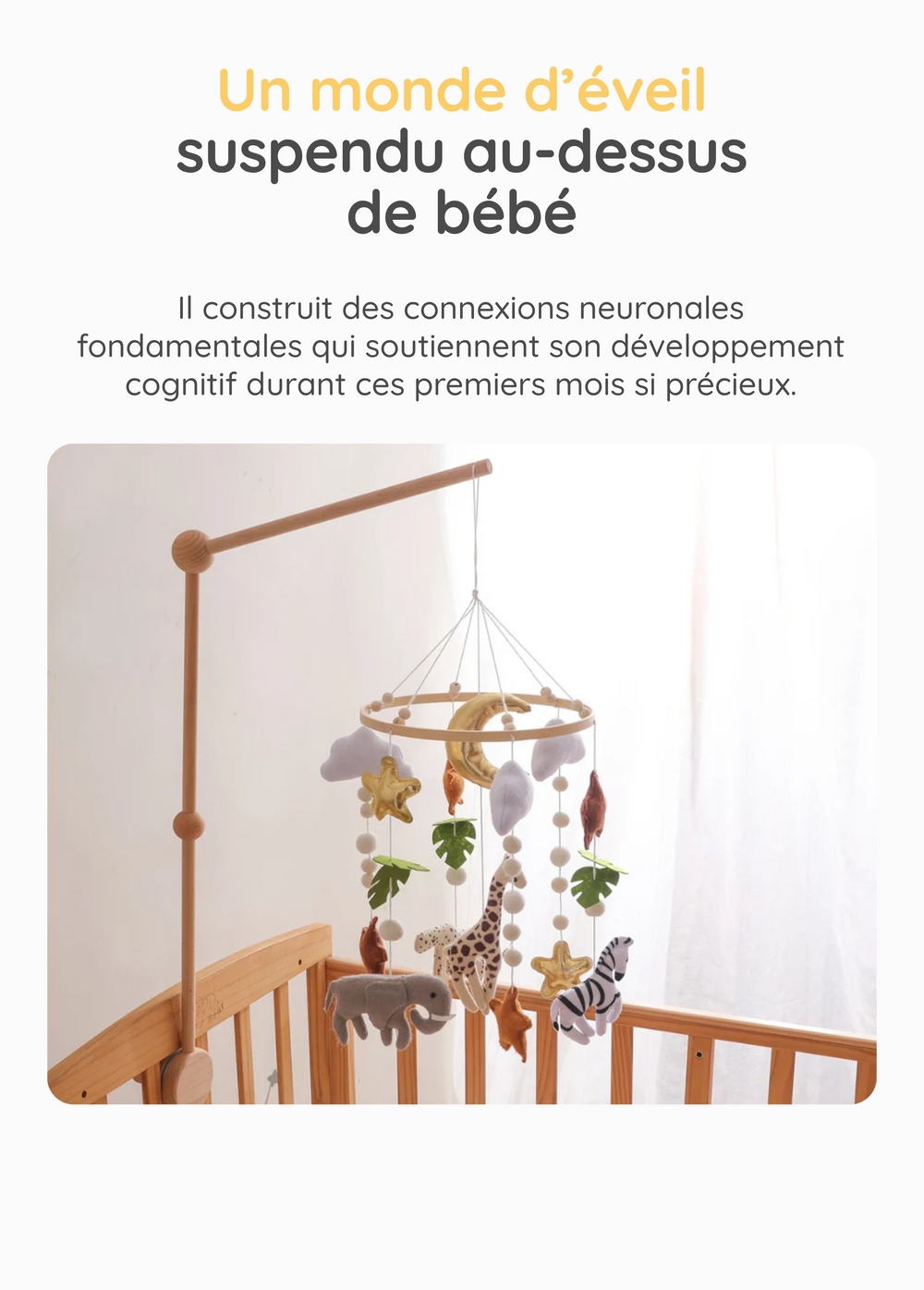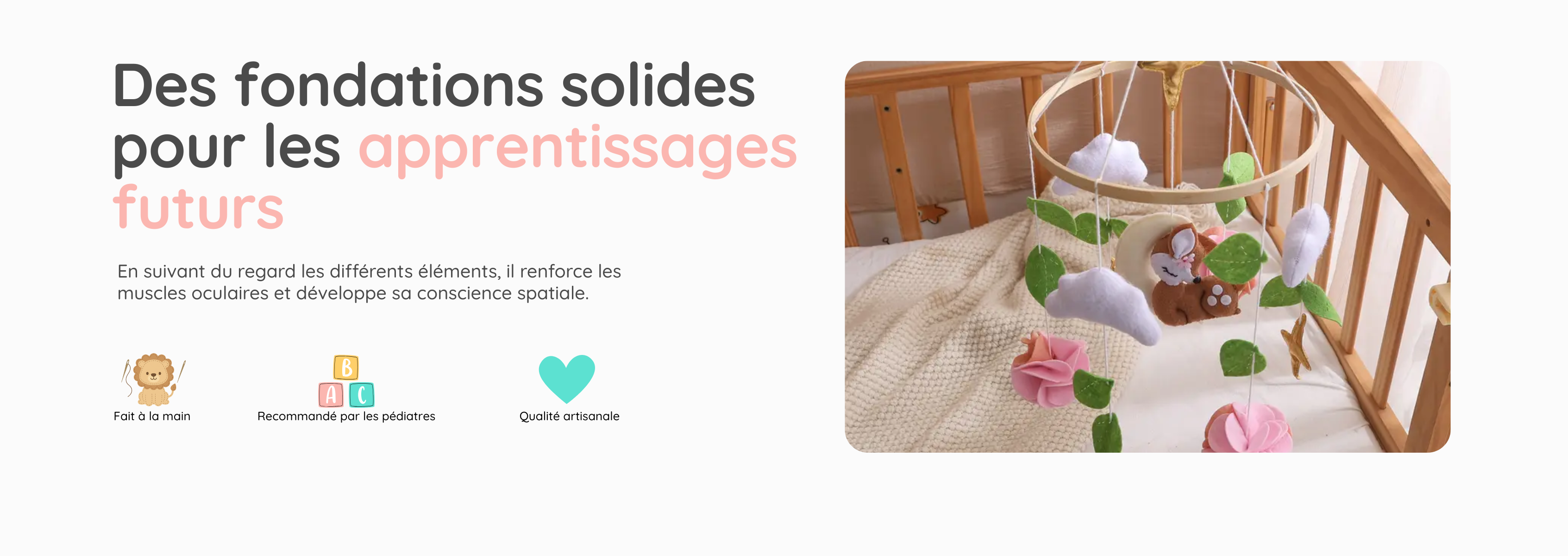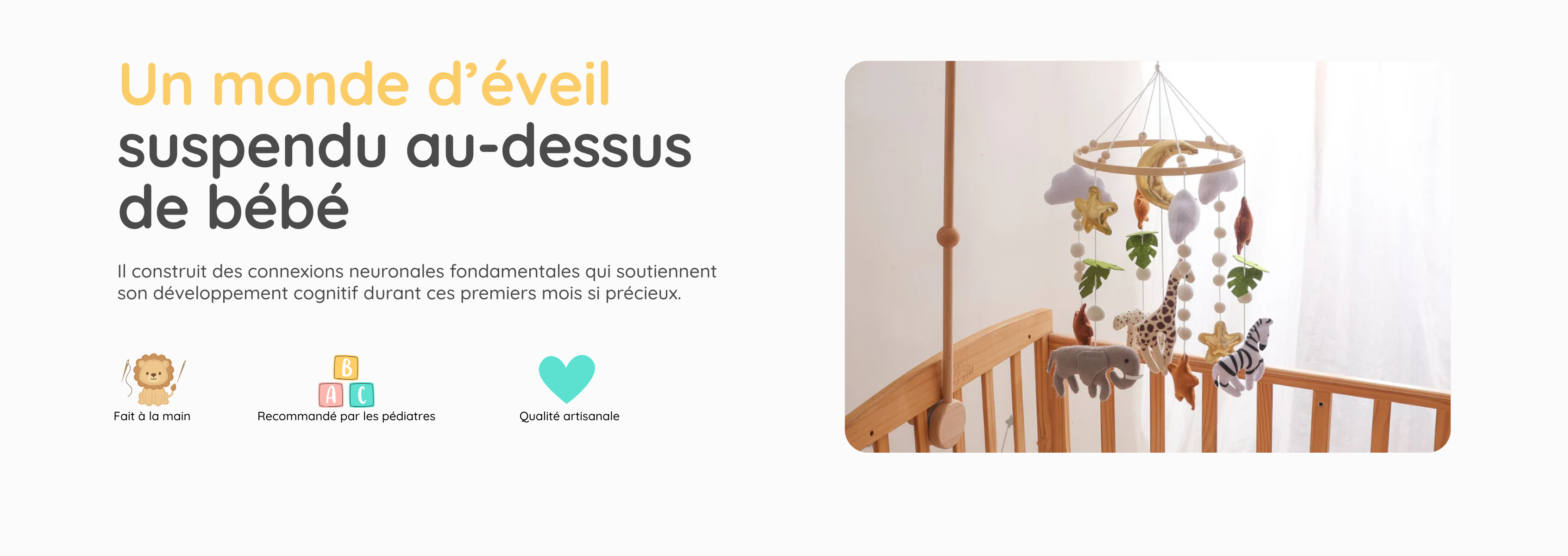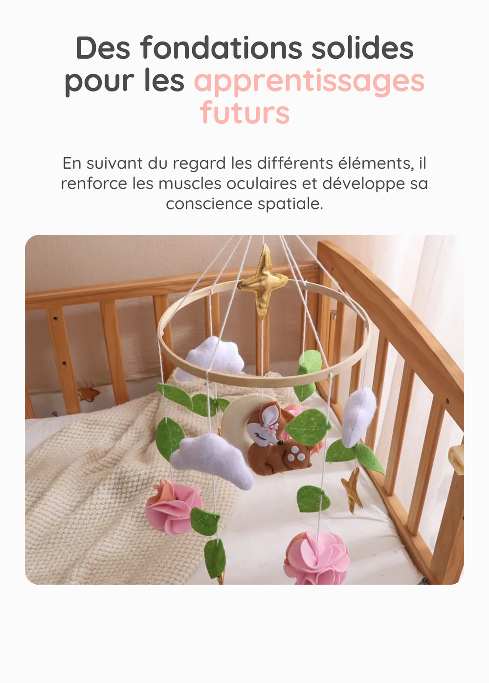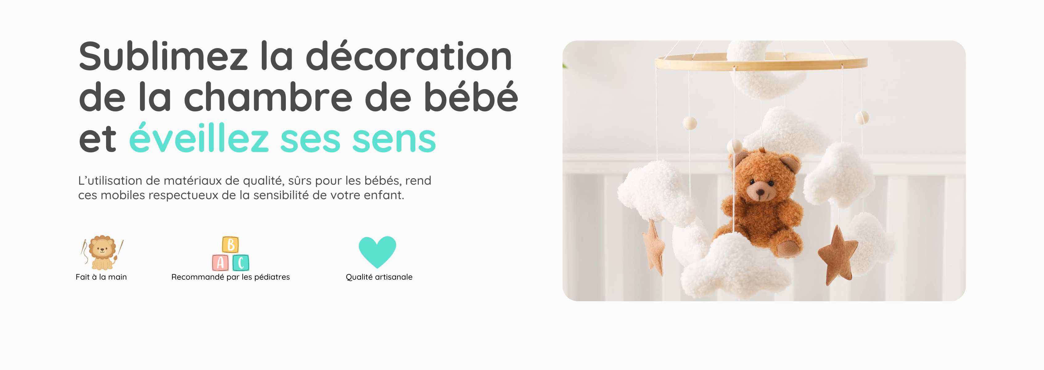 Conçus pour apaiser et stimuler votre enfant, nos mobiles offrent un large choix de designs captivants et de matériaux de qualité. Chaque mobile est pensé pour s'intégrer harmonieusement à la chambre de bébé tout en favorisant son éveil sensoriel.