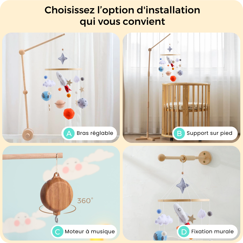 Et même si le mobile venait à être saisi par bébé, soyez rassuré : chaque modèle est conçu pour qu’aucun élément ne puisse se détacher. Nous recommandons d’installer le mobile hors de portée directe de bébé. En utilisant nos supports (vendus séparément), vous avez l’assurance d’une installation stable, sécurisée et à la bonne distance.