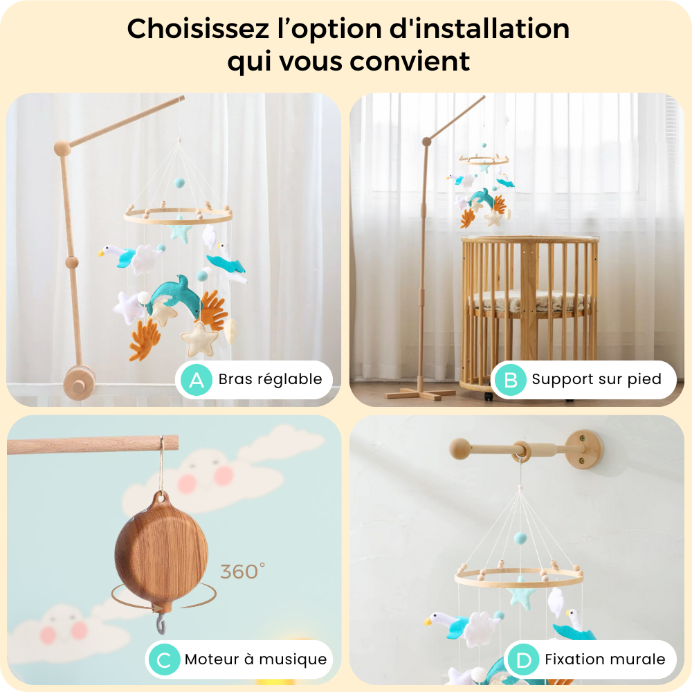 Et même si le mobile venait à être saisi par bébé, soyez rassuré : chaque modèle est conçu pour qu’aucun élément ne puisse se détacher. Nous recommandons d’installer le mobile hors de portée directe de bébé. En utilisant nos supports (vendus séparément), vous avez l’assurance d’une installation stable, sécurisée et à la bonne distance.