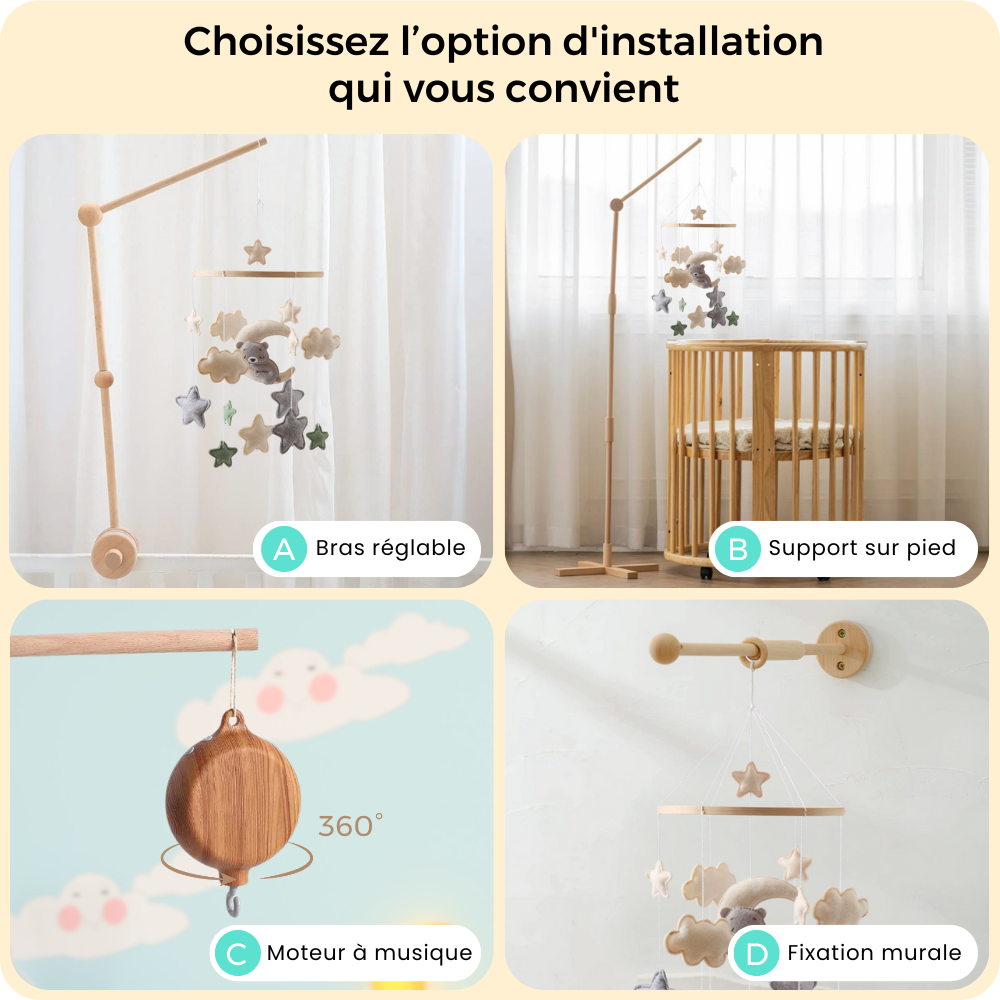 Et même si le mobile venait à être saisi par bébé, soyez rassuré : chaque modèle est conçu pour qu’aucun élément ne puisse se détacher. Nous recommandons d’installer le mobile hors de portée directe de bébé. En utilisant nos supports (vendus séparément), vous avez l’assurance d’une installation stable, sécurisée et à la bonne distance.