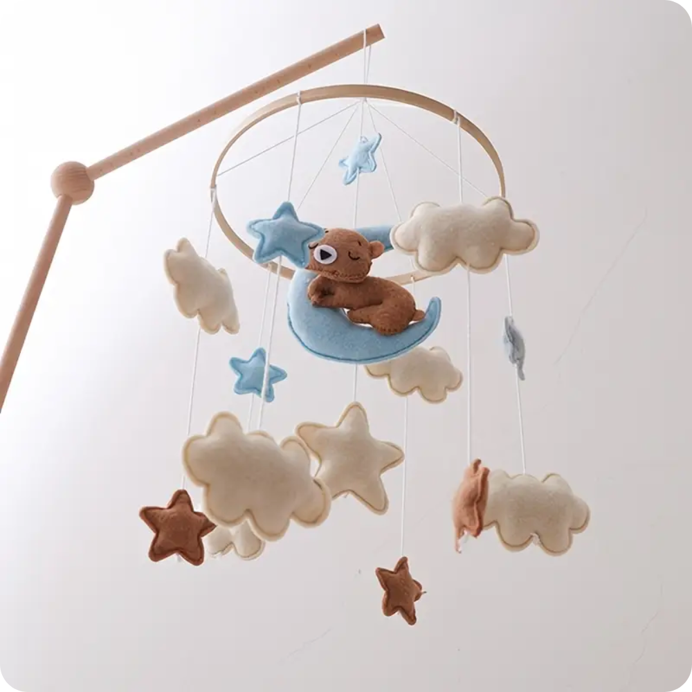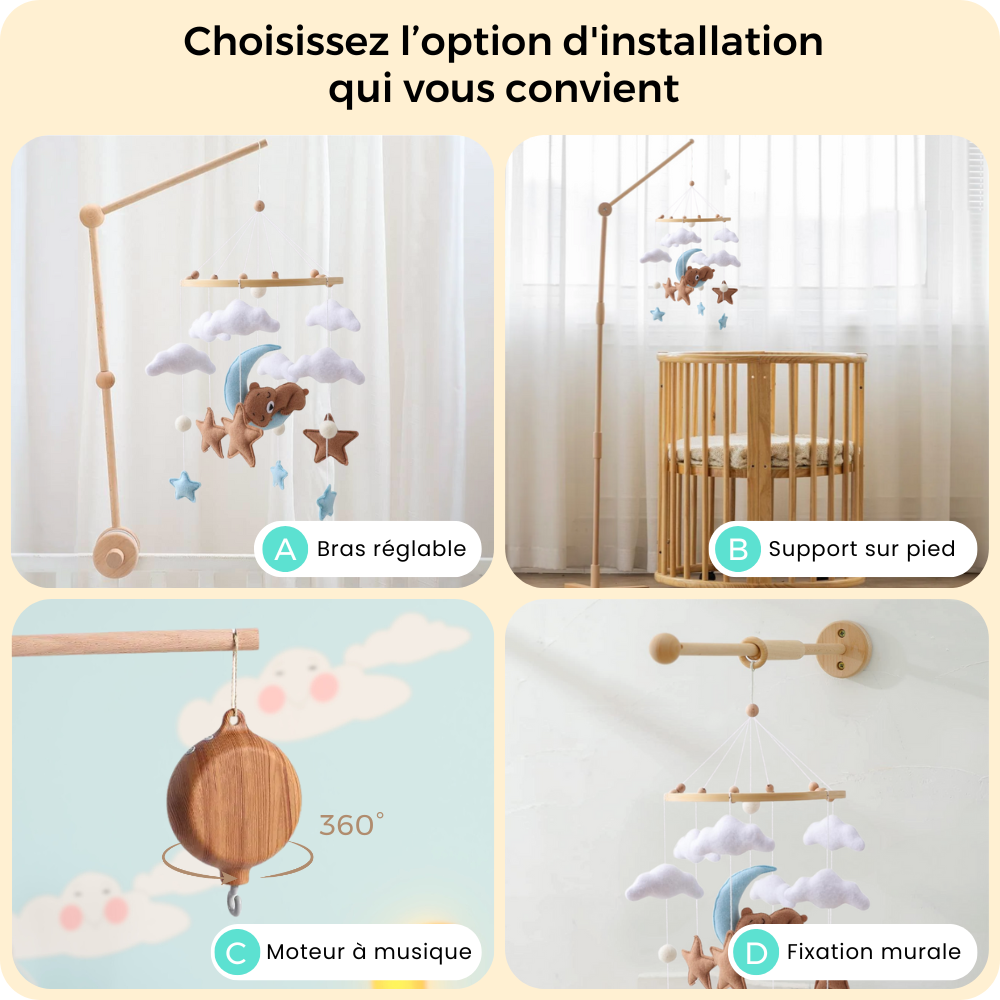 Et même si le mobile venait à être saisi par bébé, soyez rassuré : chaque modèle est conçu pour qu’aucun élément ne puisse se détacher. Nous recommandons d’installer le mobile hors de portée directe de bébé. En utilisant nos supports (vendus séparément), vous avez l’assurance d’une installation stable, sécurisée et à la bonne distance.